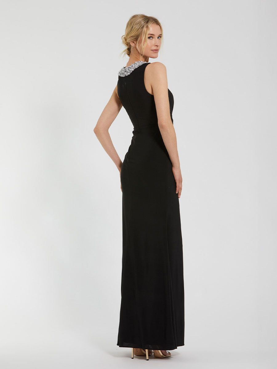 This stunning gown is crafted from soft jersey fabric, featuring a high neckline and sleeveless design for a sleek and modern look. The twist and ruched waist add flattering shape, while the embellished neckline brings a touch of sparkle. A daring thigh-high slit completes the design, making it perfect for any glamorous evening event.